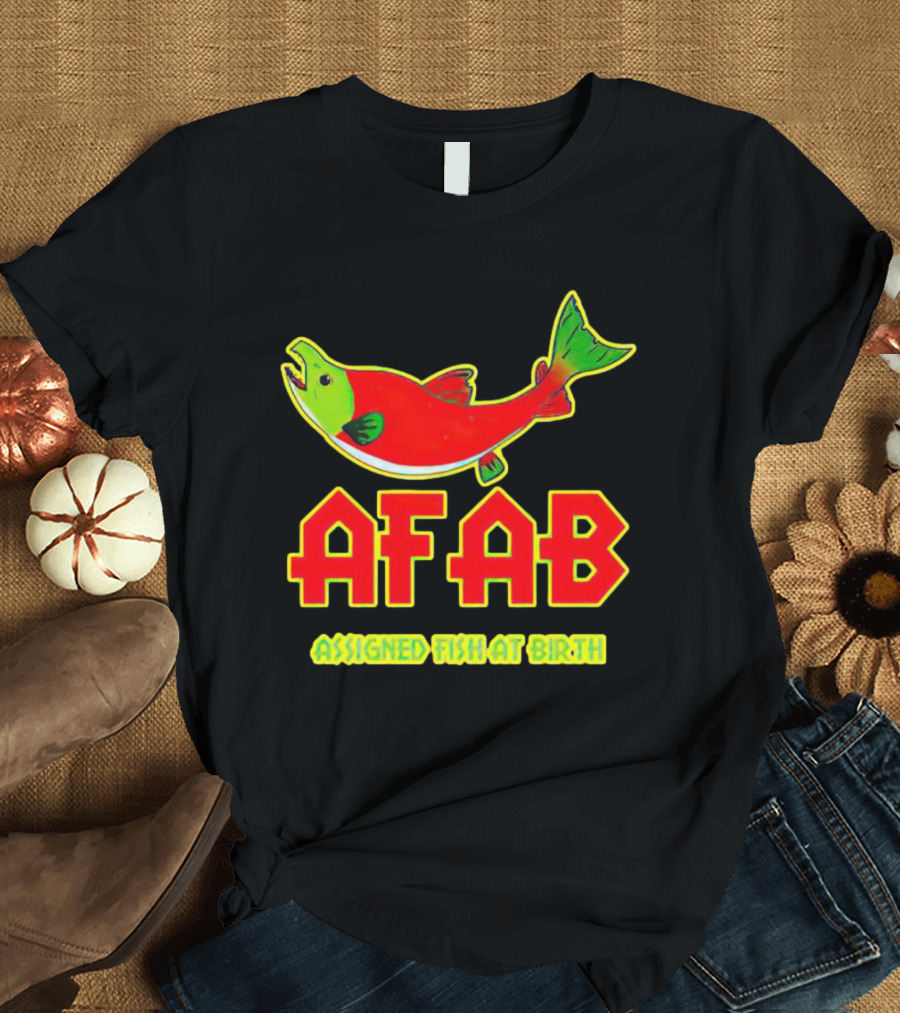 AFAB Assigned Fish at Birth Salmon Shirt made from 100% pre-shrunk ring-spun cotton, unisex regular fit based on U.S. standard sizing. The shirt is designed, cut, sewn, and printed in the United States. Available in sizes S-5XL.