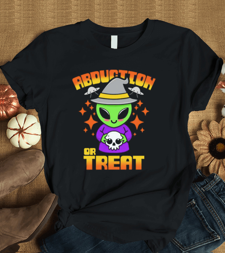 Abduction or Treat Alien Halloween Witch Hat UFOs Shirt made from 100% pre-shrunk ring-spun cotton, unisex regular fit based on U.S. standard sizing. The shirt is designed, cut, sewn, and printed in the United States. Available in sizes S-5XL.