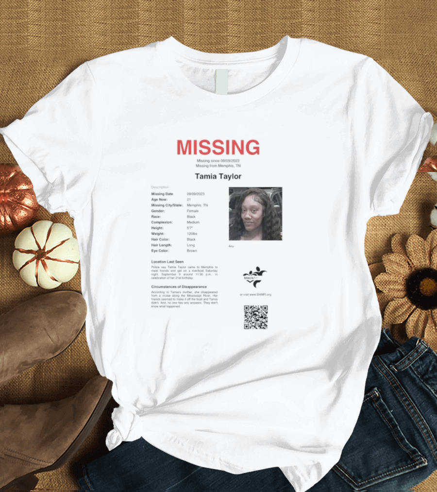 MISSING Tamia Taylor Memphis TN qr.tips/save.tamia.taylor Shirt made from 100% pre-shrunk ring-spun cotton, unisex regular fit based on U.S. standard sizing. The shirt is designed, cut, sewn, and printed in the United States. Available in sizes S-5XL.
