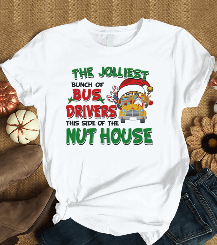 The Jolliest Bunch Of Bus Drivers This Side Of The Nut House Christmas Party Bus With Santa Hat And Reindeer T-Shirt