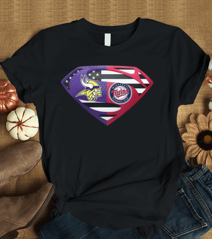 Minnesota Vikings Twins Superman Crossover Emblem Shirt made from 100% pre-shrunk ring-spun cotton, unisex regular fit based on U.S. standard sizing. The shirt is designed, cut, sewn, and printed in the United States. Available in sizes S-5XL.