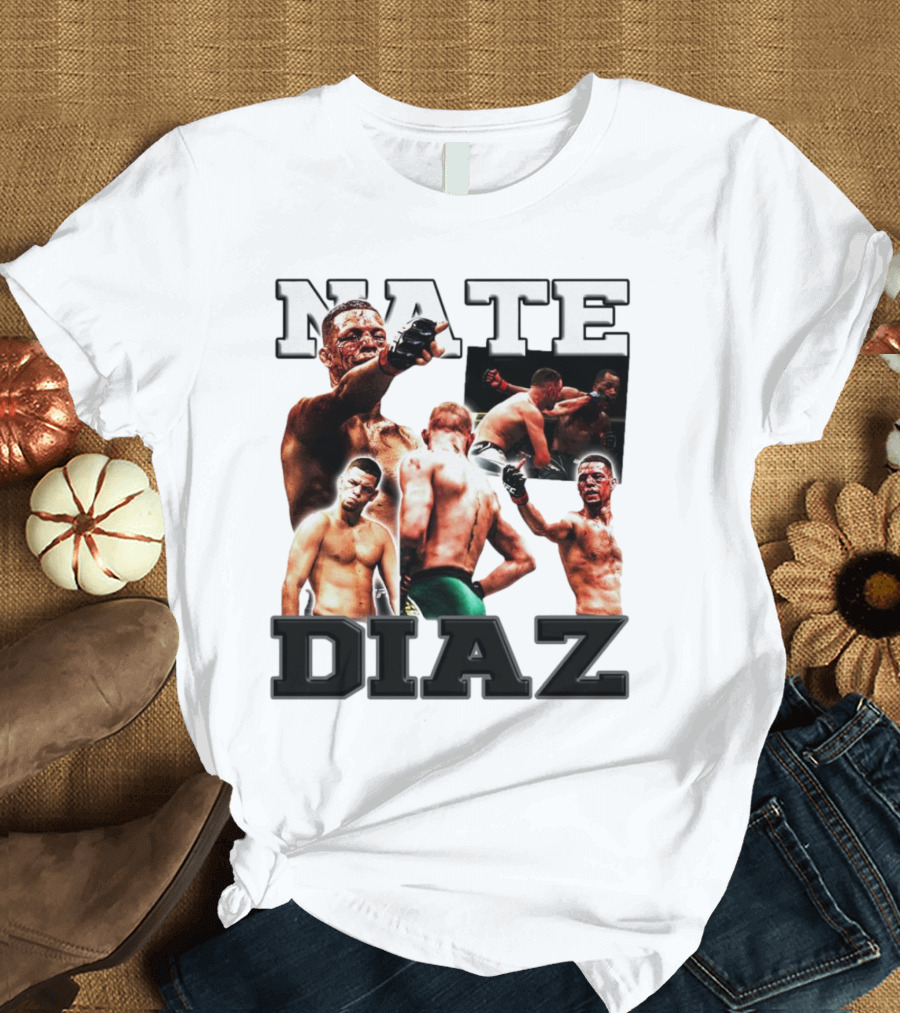 Nate Diaz MMA Fight Collage Shirt made from 100% pre-shrunk ring-spun cotton, unisex regular fit based on U.S. standard sizing. The shirt is designed, cut, sewn, and printed in the United States. Available in sizes S-5XL.