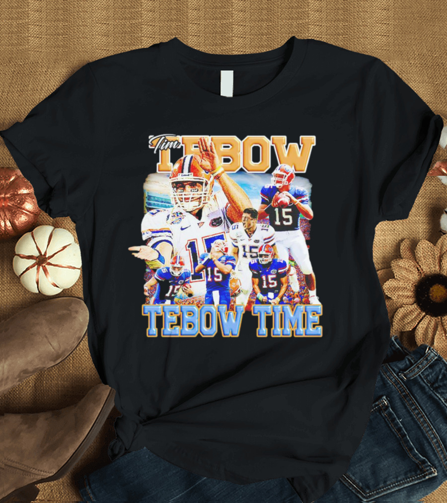 Tim Tebow Florida Gators Football Tebow Time 15 Quarterback Legend Shirt made from 100% pre-shrunk ring-spun cotton, unisex regular fit based on U.S. standard sizing. The shirt is designed, cut, sewn, and printed in the United States. Available in sizes S-5XL.