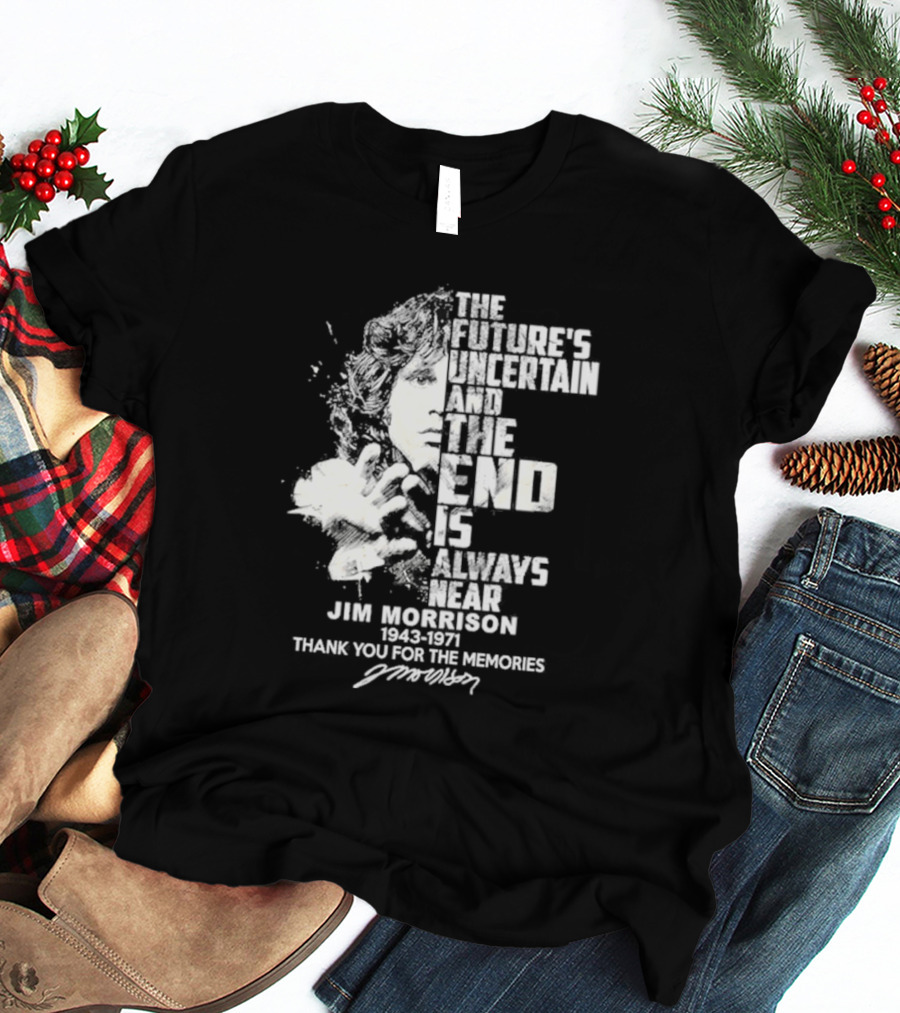 The Future's Uncertain and the End is Always Near Jim Morrison 1943-1971 Thank You for the Memories Signature Shirt made from 100% pre-shrunk ring-spun cotton, unisex regular fit based on U.S. standard sizing. The shirt is designed, cut, sewn, and printed in the United States. Available in sizes S-5XL.