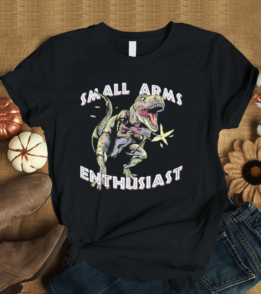 Small Arms Enthusiast Dinosaur T-Rex with Toy Gun Shirt made from 100% pre-shrunk ring-spun cotton, unisex regular fit based on U.S. standard sizing. The shirt is designed, cut, sewn, and printed in the United States. Available in sizes S-5XL.