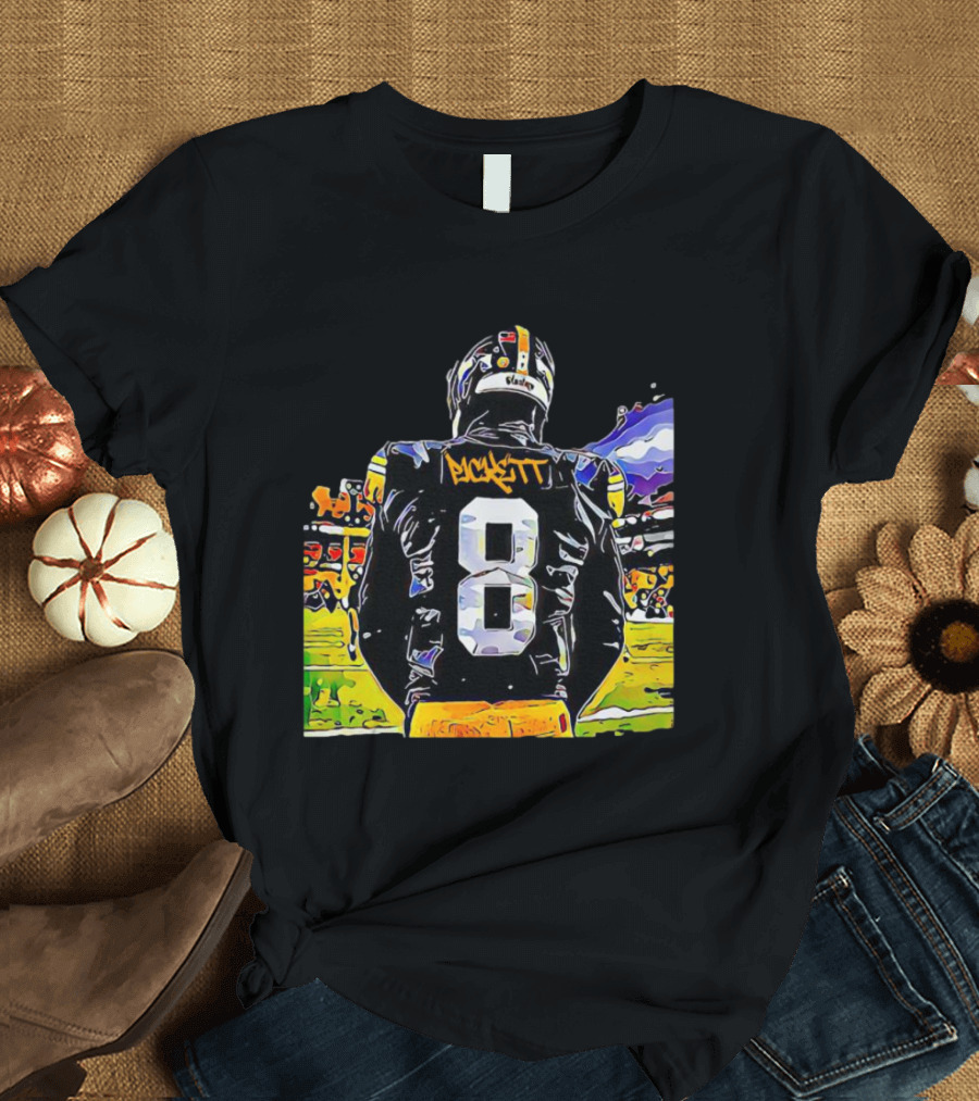 Kenny Pickett Number 8 Football Celebration Steelers Shirt made from 100% pre-shrunk ring-spun cotton, unisex regular fit based on U.S. standard sizing. The shirt is designed, cut, sewn, and printed in the United States. Available in sizes S-5XL.