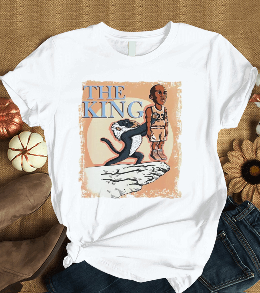 The King Michael Jordan Simba Parody with Rafiki and Basketball Jersey Shirt made from 100% pre-shrunk ring-spun cotton, unisex regular fit based on U.S. standard sizing. The shirt is designed, cut, sewn, and printed in the United States. Available in sizes S-5XL.