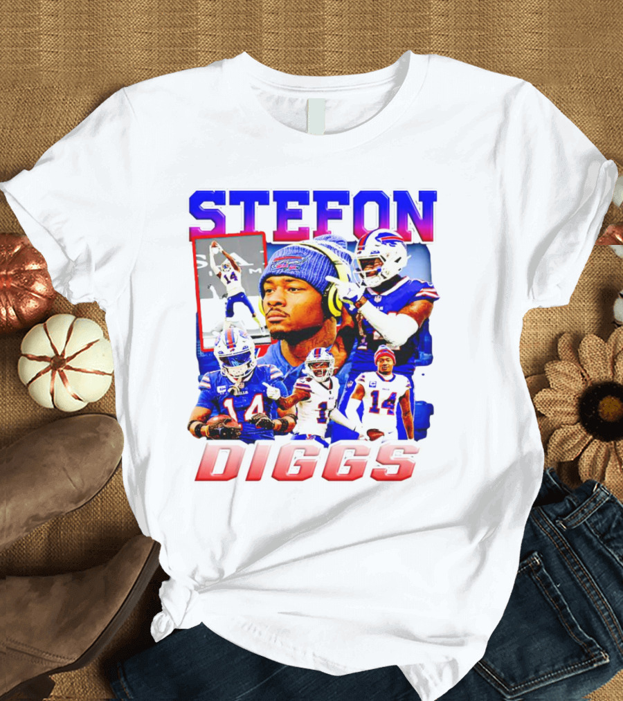 Stefon Diggs Buffalo Bills Football NFL Player Collage in Action Shirt made from 100% pre-shrunk ring-spun cotton, unisex regular fit based on U.S. standard sizing. The shirt is designed, cut, sewn, and printed in the United States. Available in sizes S-5XL.
