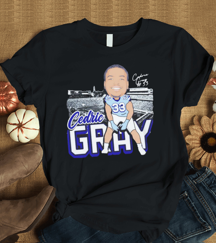 Cedric Gray #33 Caricature Football Stadium Signature Shirt made from 100% pre-shrunk ring-spun cotton, unisex regular fit based on U.S. standard sizing. The shirt is designed, cut, sewn, and printed in the United States. Available in sizes S-5XL.