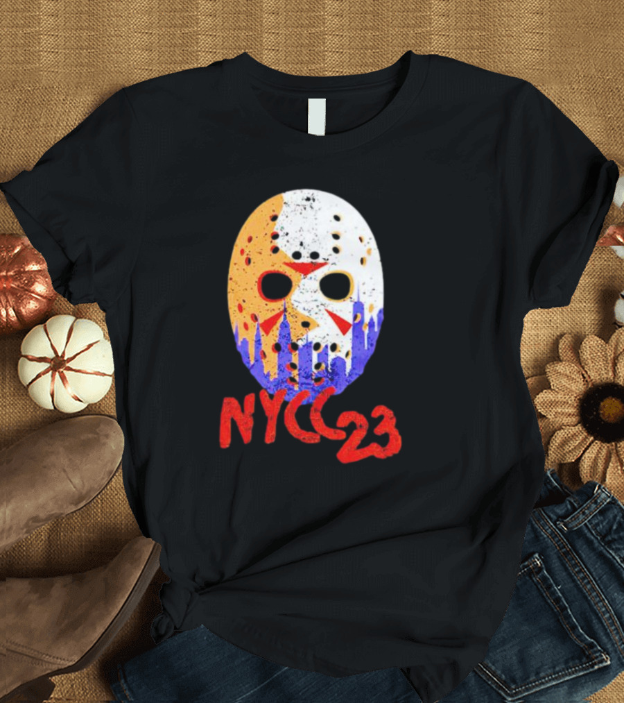 NYCC 23 Jason Voorhees Hockey Mask Skyline Shirt made from 100% pre-shrunk ring-spun cotton, unisex regular fit based on U.S. standard sizing. The shirt is designed, cut, sewn, and printed in the United States. Available in sizes S-5XL.