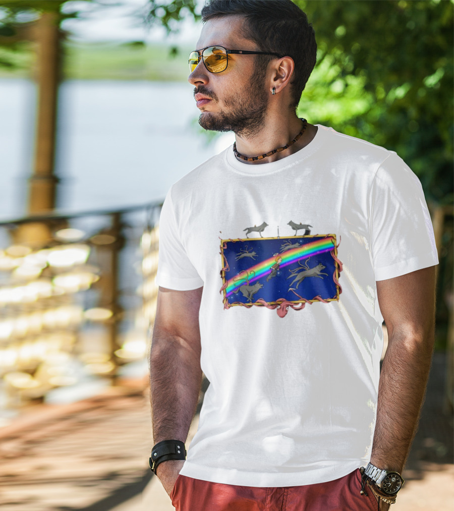 Capcom Resident Evil 4 The Masterpiece Theater I'm Tired Rainbow Flying Dogs Shirt made from 100% pre-shrunk ring-spun cotton, unisex regular fit based on U.S. standard sizing. The shirt is designed, cut, sewn, and printed in the United States. Available in sizes S-5XL.