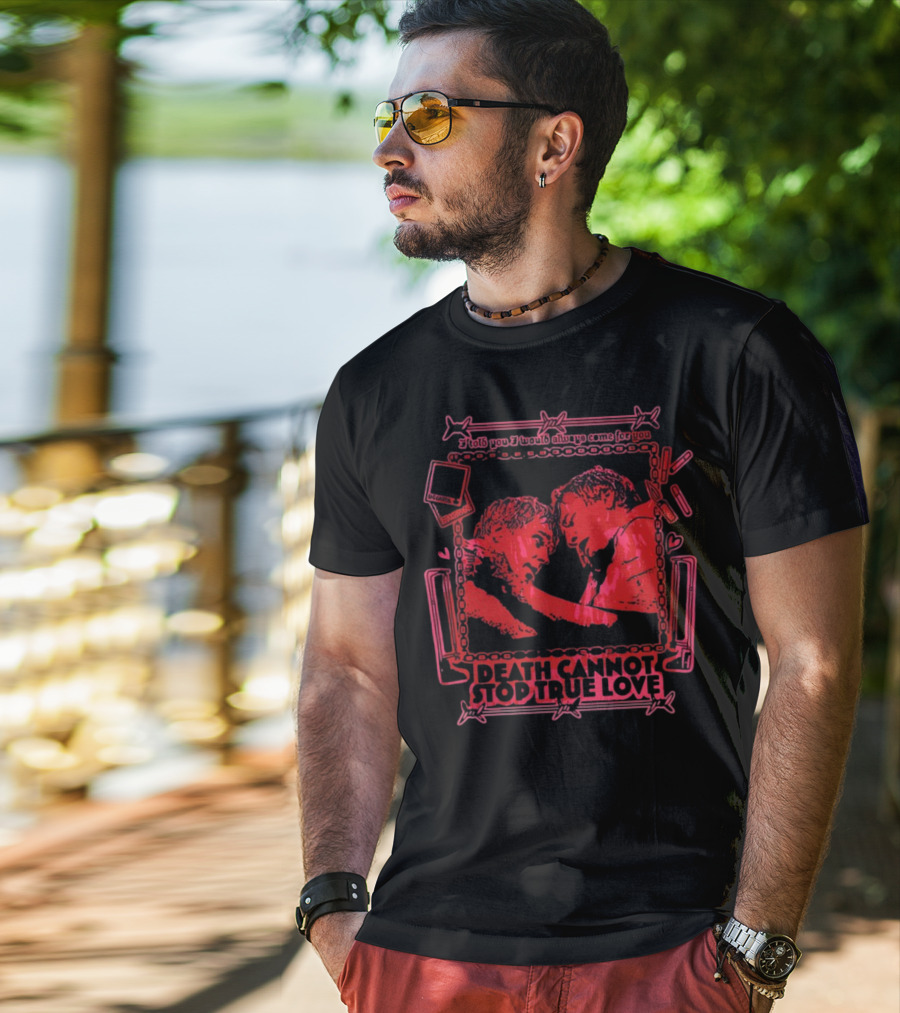 I Told You I Would Always Come for You Death Cannot Stop True Love Retro Romance Shirt made from 100% pre-shrunk ring-spun cotton, unisex regular fit based on U.S. standard sizing. The shirt is designed, cut, sewn, and printed in the United States. Available in sizes S-5XL.