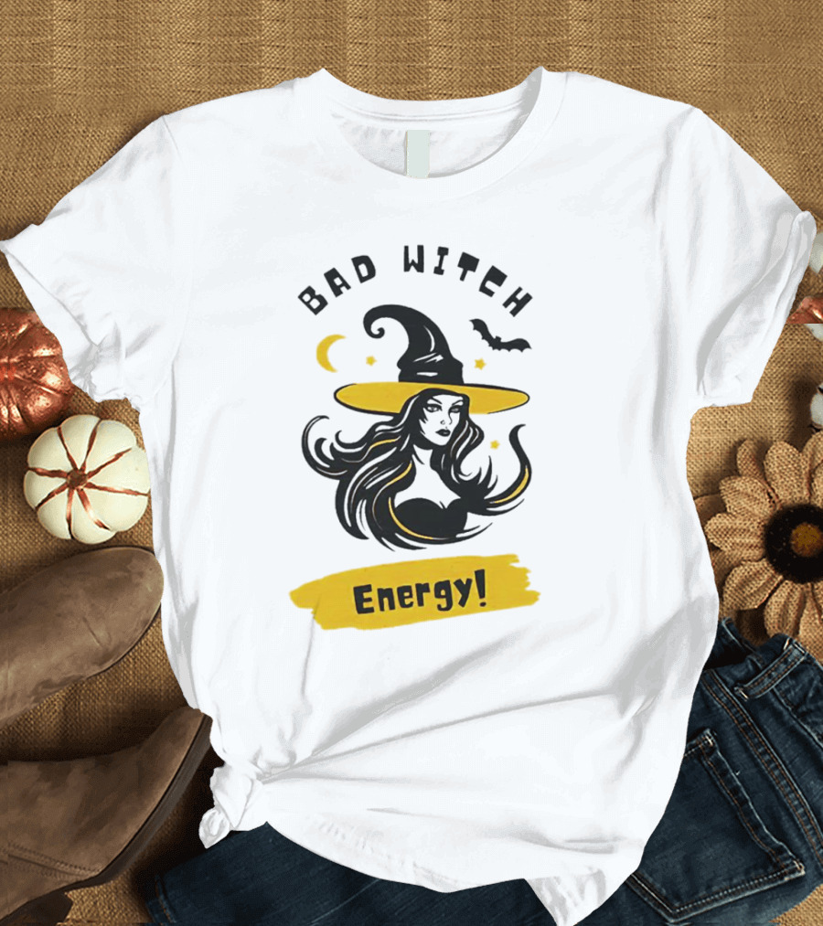 Bad Witch Energy Halloween Moon Bat Hat Shirt made from 100% pre-shrunk ring-spun cotton, unisex regular fit based on U.S. standard sizing. The shirt is designed, cut, sewn, and printed in the United States. Available in sizes S-5XL.