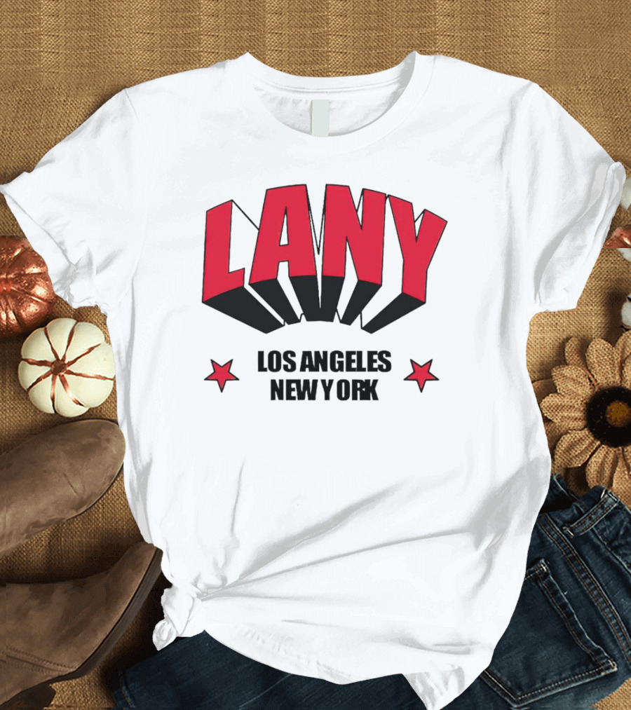 LANY Los Angeles New York Bold Red Stars Shirt made from 100% pre-shrunk ring-spun cotton, unisex regular fit based on U.S. standard sizing. The shirt is designed, cut, sewn, and printed in the United States. Available in sizes S-5XL.