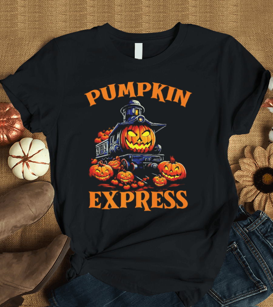 PUMPKIN EXPRESS Halloween Train with Jack-o'-Lantern Faces Shirt made from 100% pre-shrunk ring-spun cotton, unisex regular fit based on U.S. standard sizing. The shirt is designed, cut, sewn, and printed in the United States. Available in sizes S-5XL.