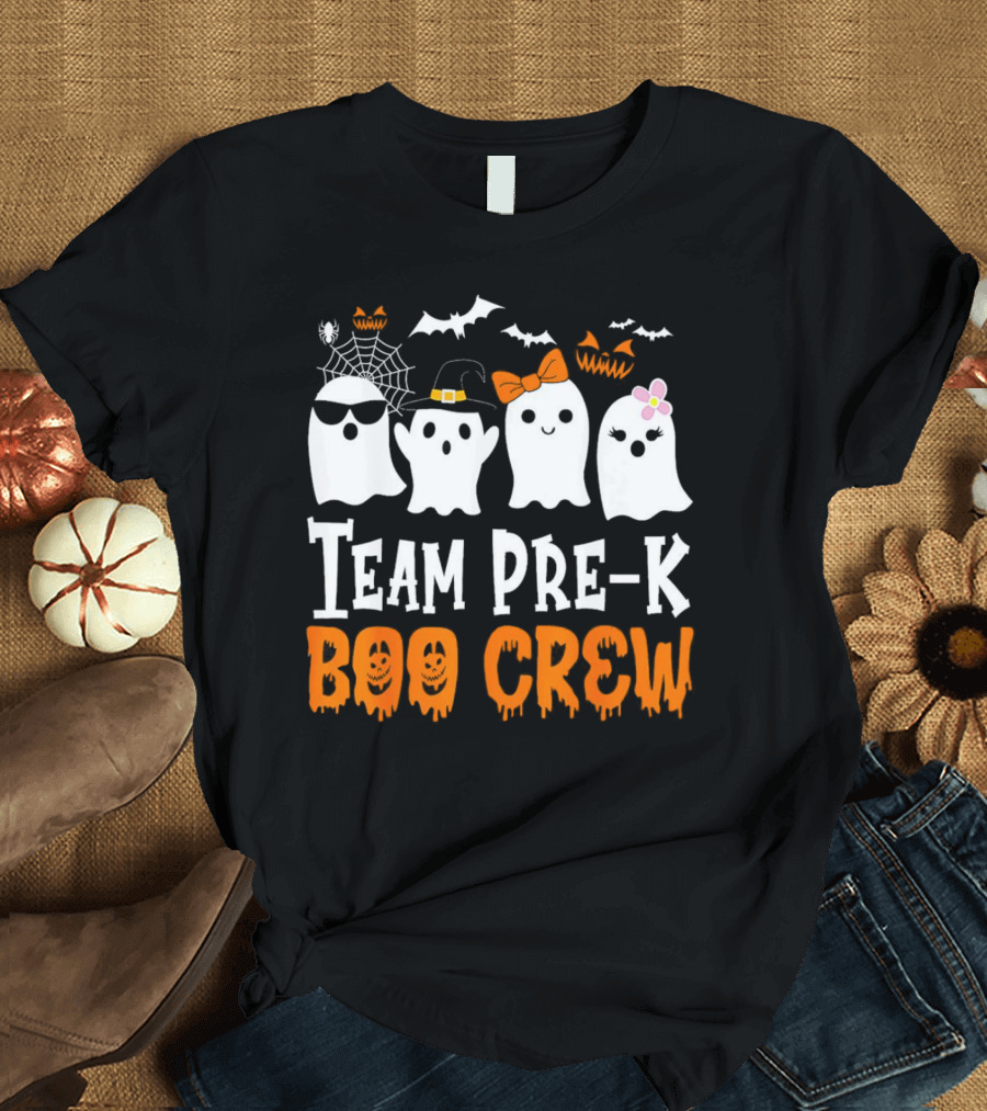 Team Pre-K Boo Crew Halloween Ghosts with Hats and Bows Shirt made from 100% pre-shrunk ring-spun cotton, unisex regular fit based on U.S. standard sizing. The shirt is designed, cut, sewn, and printed in the United States. Available in sizes S-5XL.