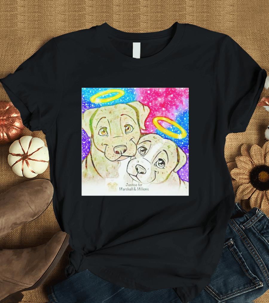 Justice for Marshall and Millions Halo Dogs Shirt made from 100% pre-shrunk ring-spun cotton, unisex regular fit based on U.S. standard sizing. The shirt is designed, cut, sewn, and printed in the United States. Available in sizes S-5XL.