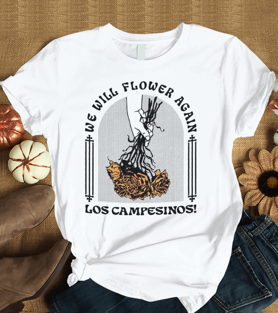 We Will Flower Again Los Campesinos Hand Holding Orange Roses Shirt made from 100% pre-shrunk ring-spun cotton, unisex regular fit based on U.S. standard sizing. The shirt is designed, cut, sewn, and printed in the United States. Available in sizes S-5XL.