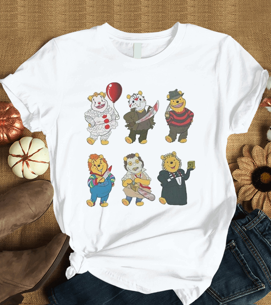 Pooh Bear Halloween Horror Characters Pennywise Jason Freddy Chucky Leatherface Pinhead T-Shirt
