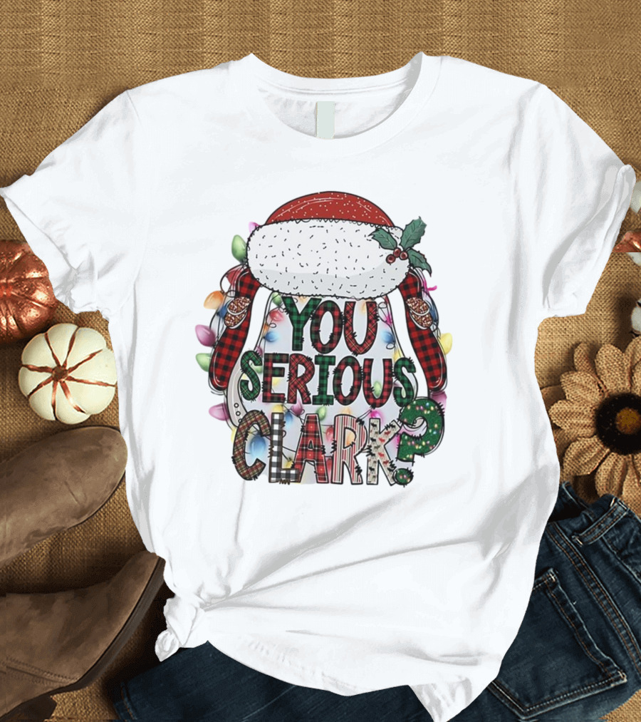 You Serious Clark Christmas Santa Hat Lights Shirt made from 100% pre-shrunk ring-spun cotton, unisex regular fit based on U.S. standard sizing. The shirt is designed, cut, sewn, and printed in the United States. Available in sizes S-5XL.
