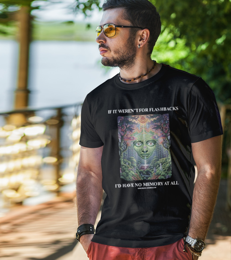 If It Weren't For Flashbacks I'd Have No Memory At All Psychedelic Forest Face Shirt made from 100% pre-shrunk ring-spun cotton, unisex regular fit based on U.S. standard sizing. The shirt is designed, cut, sewn, and printed in the United States. Available in sizes S-5XL.