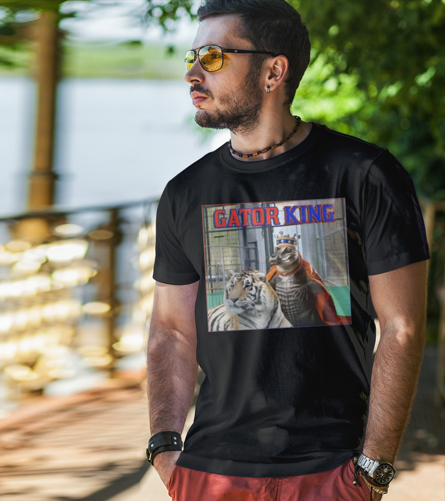 Gator King Crowned Alligator with Tiger Shirt made from 100% pre-shrunk ring-spun cotton, unisex regular fit based on U.S. standard sizing. The shirt is designed, cut, sewn, and printed in the United States. Available in sizes S-5XL.