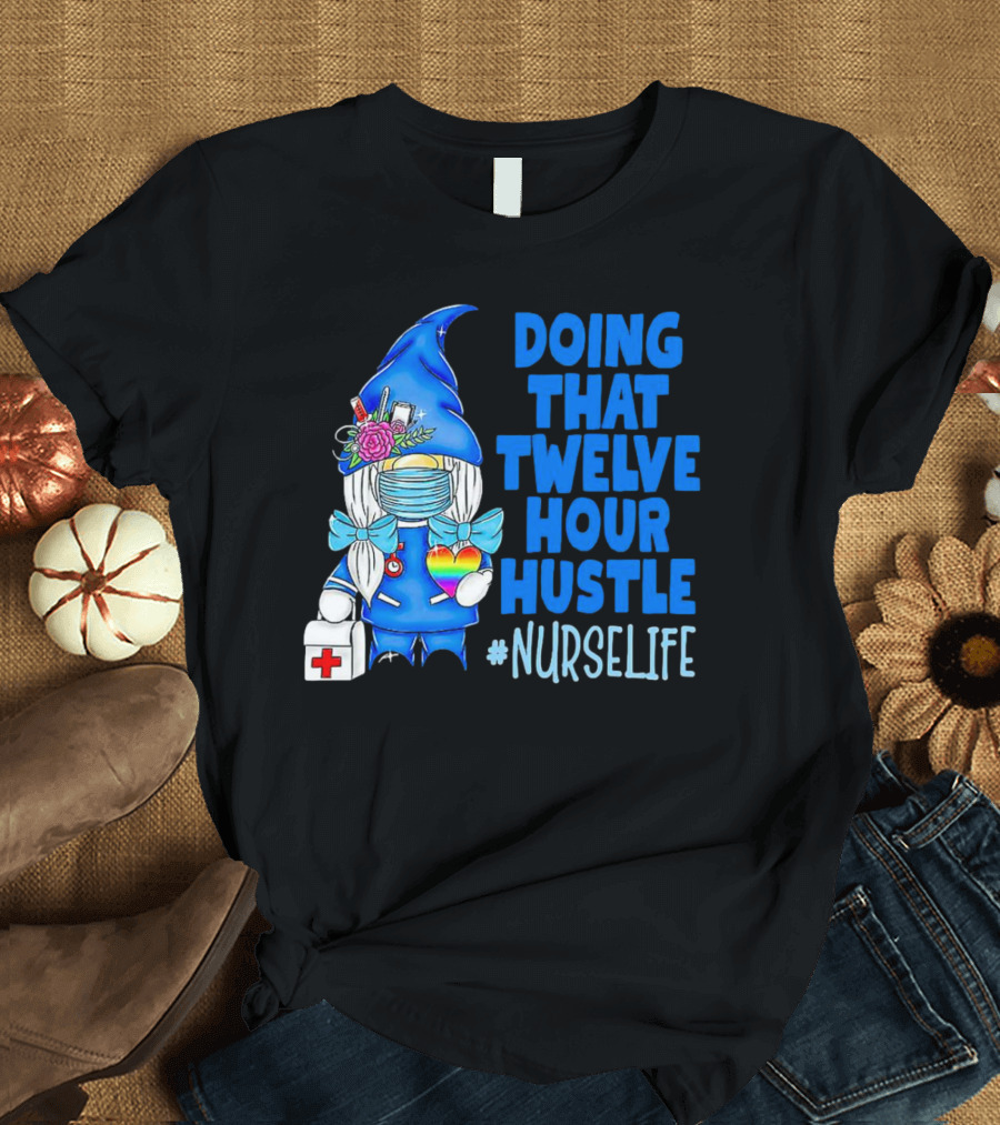 Doing That Twelve Hour Hustle Nurse Life Gnome With Mask And Medical Supplies T-Shirt