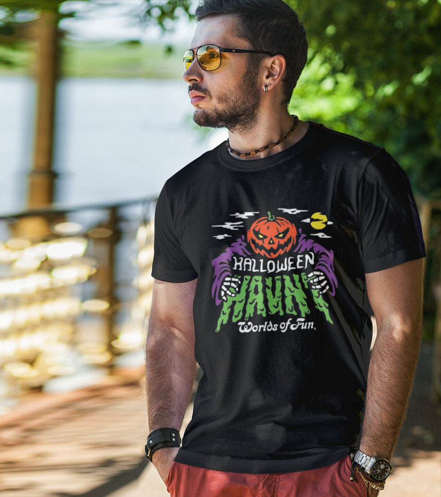 Halloween Haunt Pumpkin Worlds Of Fun Shirt made from 100% pre-shrunk ring-spun cotton, unisex regular fit based on U.S. standard sizing. The shirt is designed, cut, sewn, and printed in the United States. Available in sizes S-5XL.