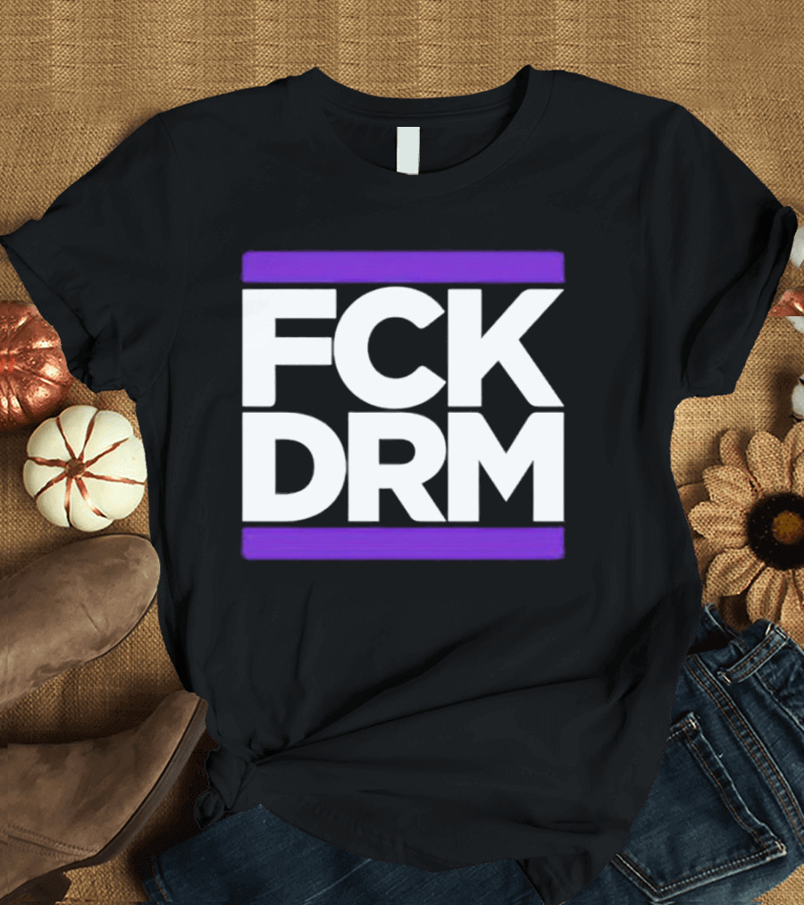 FCK DRM White Text on Purple Shirt made from 100% pre-shrunk ring-spun cotton, unisex regular fit based on U.S. standard sizing. The shirt is designed, cut, sewn, and printed in the United States. Available in sizes S-5XL.