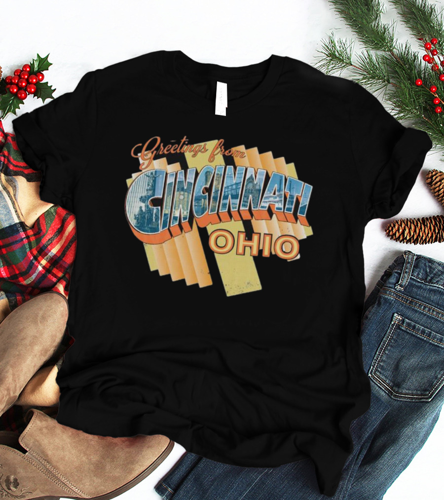 Greetings from Cincinnati Ohio Shirt made from 100% pre-shrunk ring-spun cotton, unisex regular fit based on U.S. standard sizing. The shirt is designed, cut, sewn, and printed in the United States. Available in sizes S-5XL.