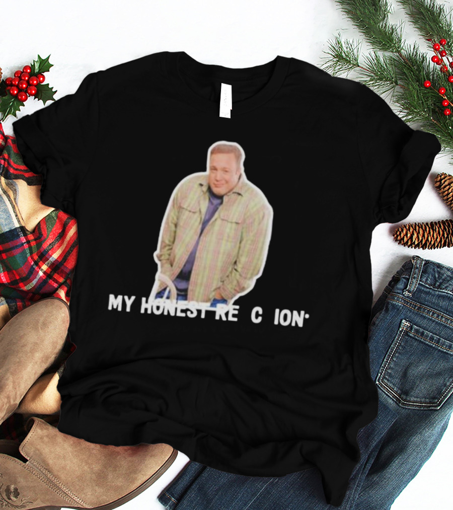 Kevin James My Honest Reaction Shirt made from 100% pre-shrunk ring-spun cotton, unisex regular fit based on U.S. standard sizing. The shirt is designed, cut, sewn, and printed in the United States. Available in sizes S-5XL.