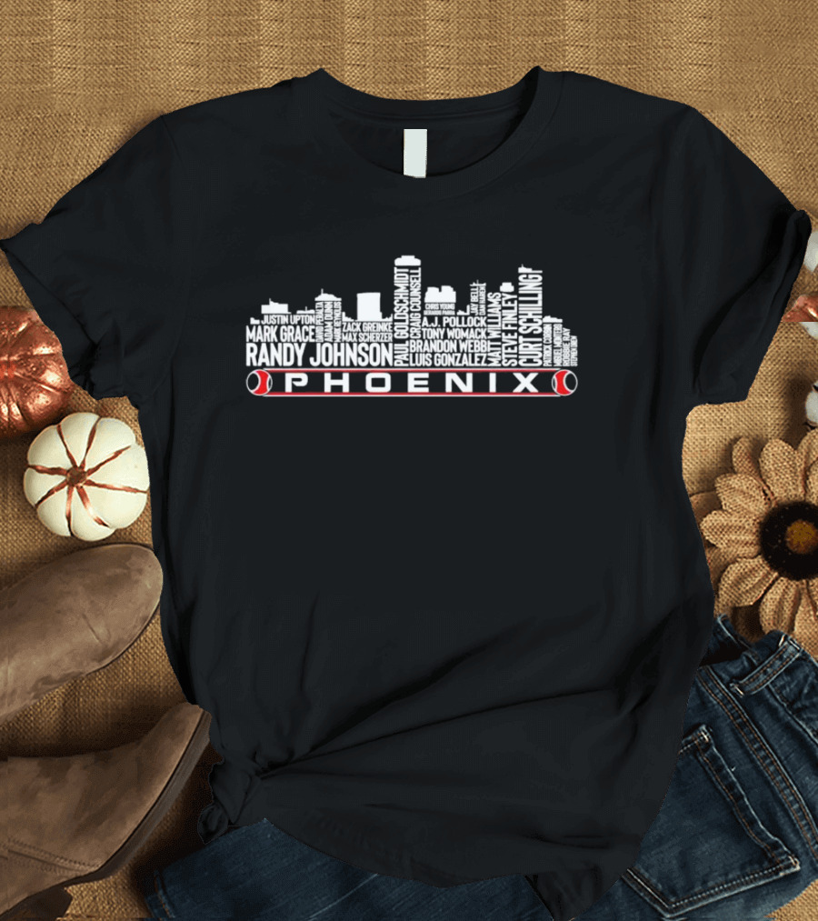 Phoenix Skyline Randy Johnson Curt Schilling Mark Grace Baseball Players Shirt made from 100% pre-shrunk ring-spun cotton, unisex regular fit based on U.S. standard sizing. The shirt is designed, cut, sewn, and printed in the United States. Available in sizes S-5XL.