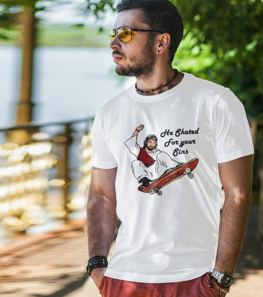 He Skated For Your Sins Red Skateboard Cross Shirt made from 100% pre-shrunk ring-spun cotton, unisex regular fit based on U.S. standard sizing. The shirt is designed, cut, sewn, and printed in the United States. Available in sizes S-5XL.