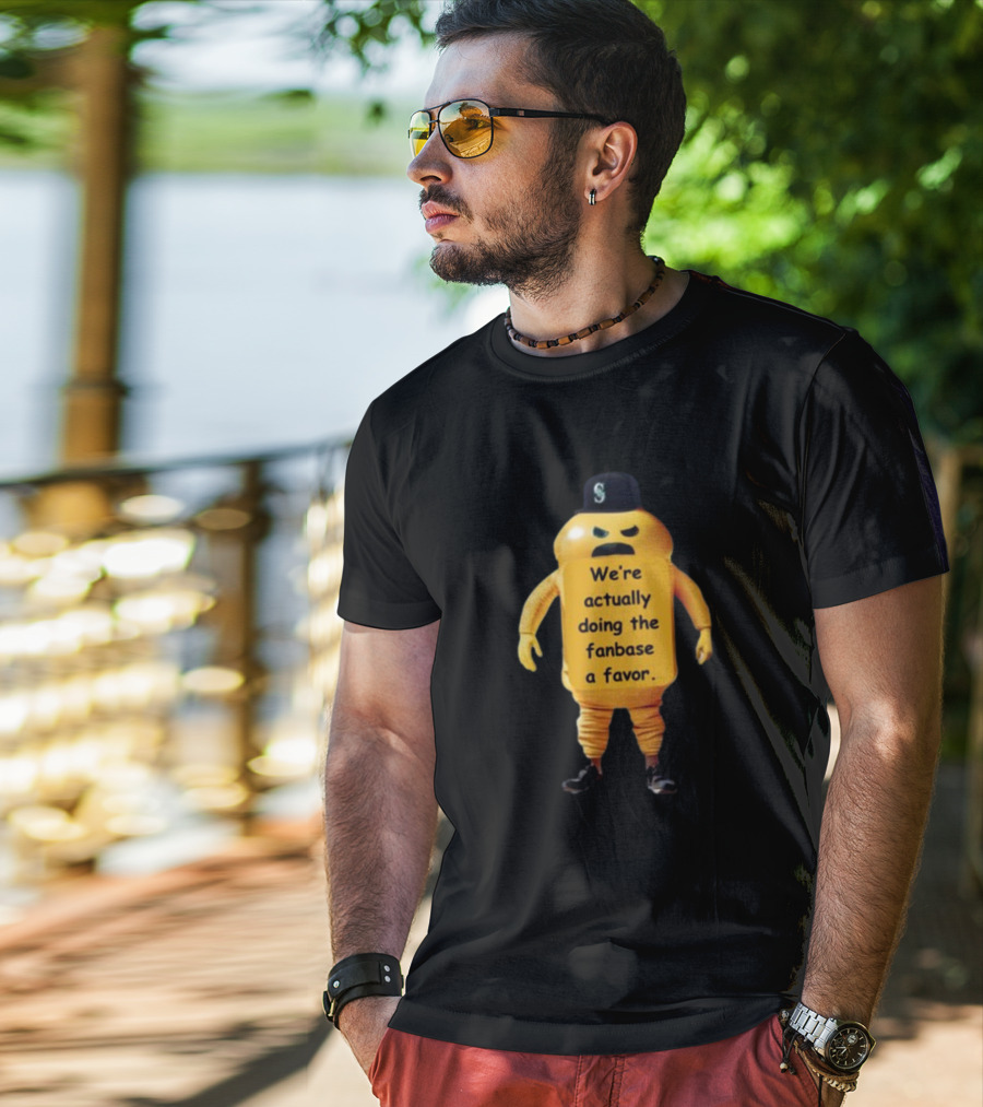 We're Actually Doing The Fanbase A Favor Mustard Bottle with Cap and Gloves Shirt made from 100% pre-shrunk ring-spun cotton, unisex regular fit based on U.S. standard sizing. The shirt is designed, cut, sewn, and printed in the United States. Available in sizes S-5XL.