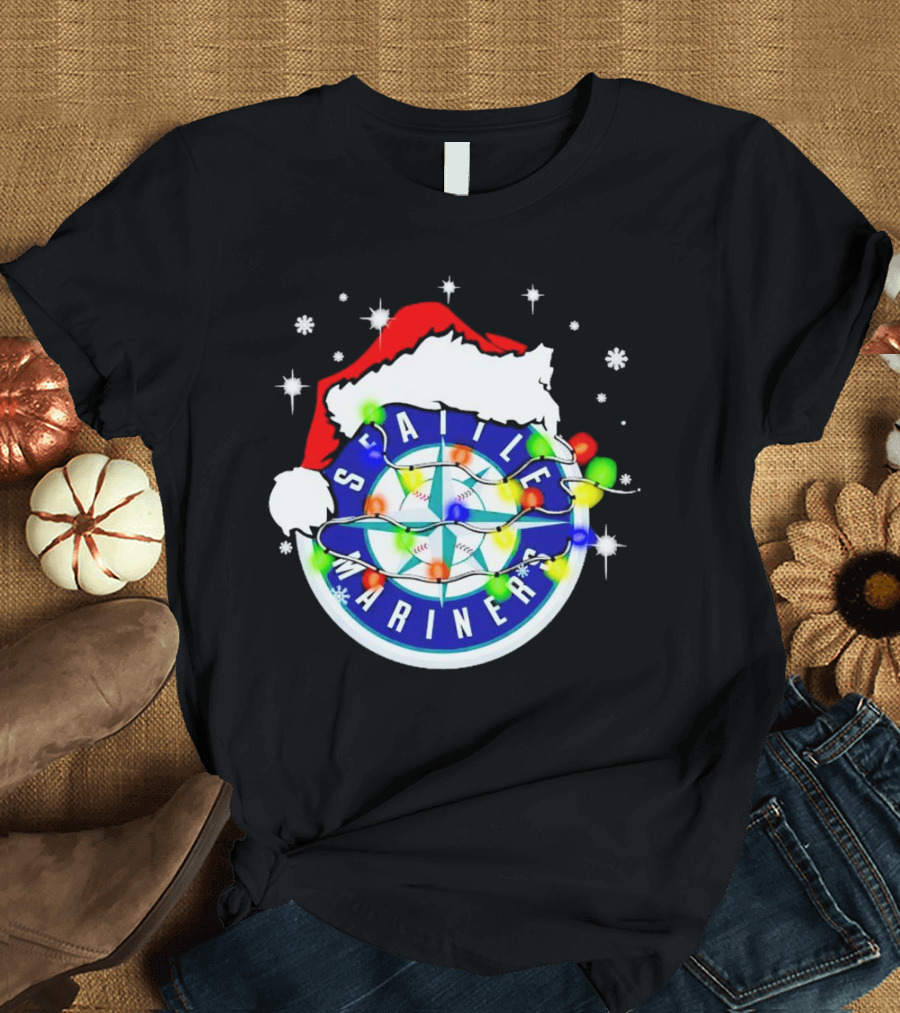 Santa Hat Seattle Mariners Christmas Lights Snowflakes T-Shirt