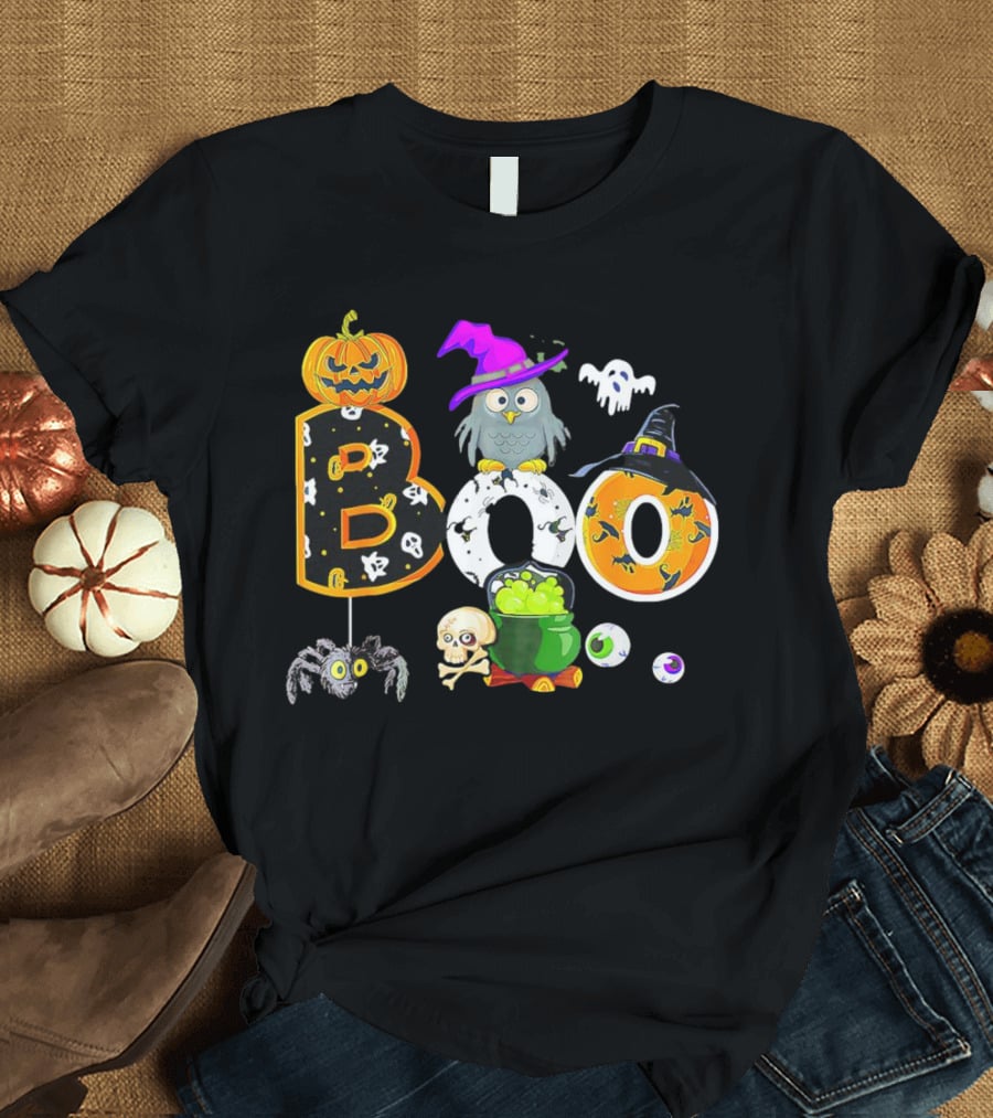 Boo Pumpkin Ghost Skull Owl Spider Witch Hat Cauldron Halloween T-Shirt