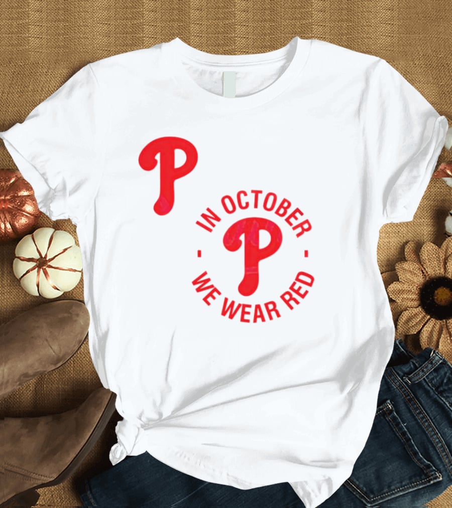 Phillies P Logo In October We Wear Red Shirt made from 100% pre-shrunk ring-spun cotton, unisex regular fit based on U.S. standard sizing. The shirt is designed, cut, sewn, and printed in the United States. Available in sizes S-5XL.