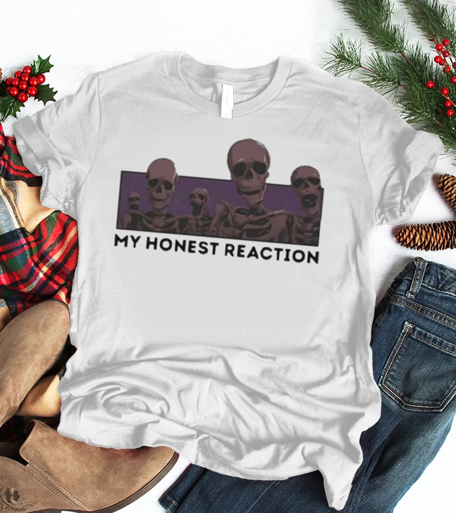 My Honest Reaction Skeletons Scene Shirt made from 100% pre-shrunk ring-spun cotton, unisex regular fit based on U.S. standard sizing. The shirt is designed, cut, sewn, and printed in the United States. Available in sizes S-5XL.
