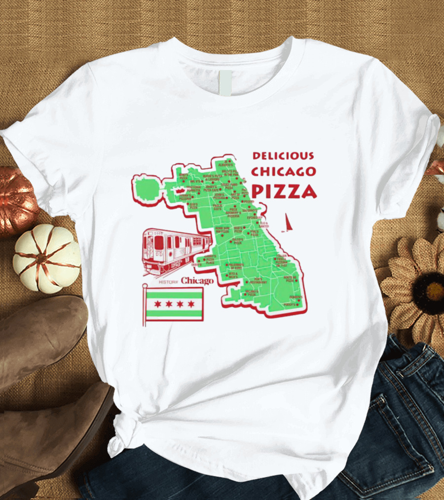 Chicago Map Train Flag Delicious Chicago Pizza Shirt made from 100% pre-shrunk ring-spun cotton, unisex regular fit based on U.S. standard sizing. The shirt is designed, cut, sewn, and printed in the United States. Available in sizes S-5XL.