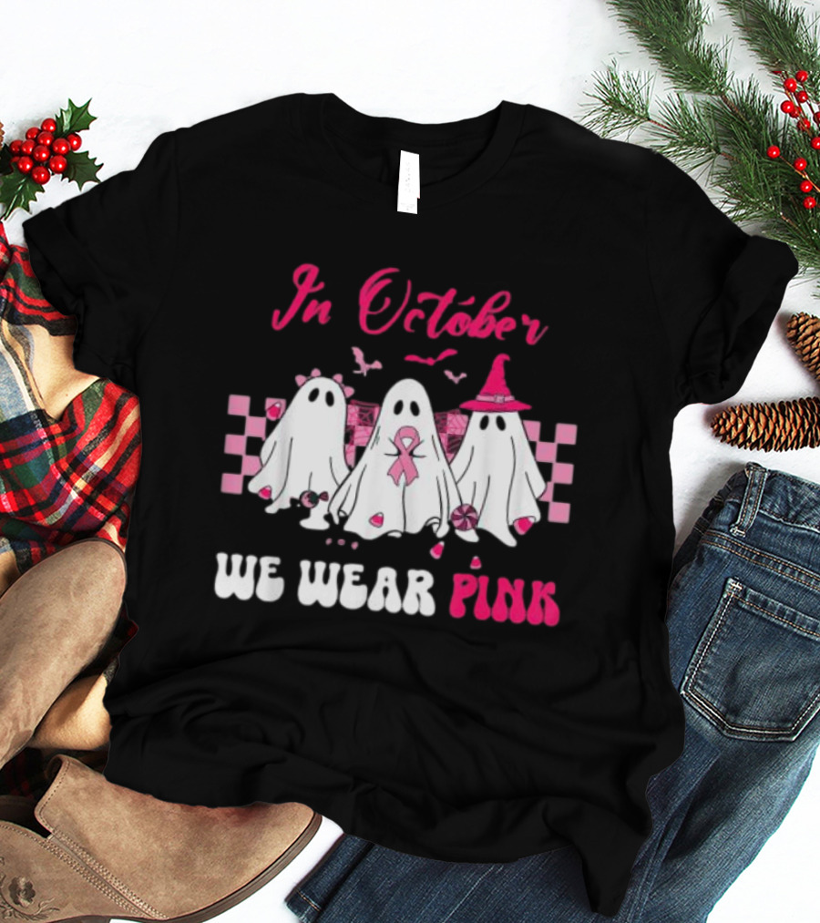 In October We Wear Pink Breast Cancer Ghost Halloween Groovy T-Shirt