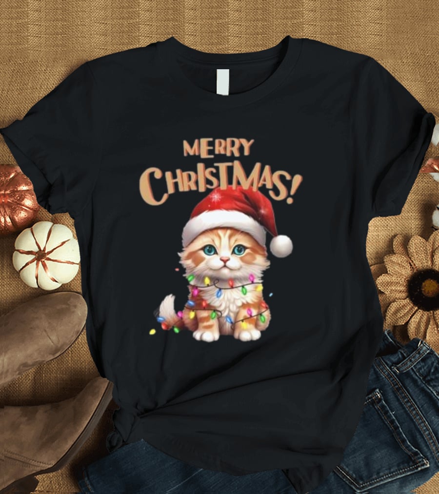Merry Christmas Cat Santa With Lights T-Shirt
