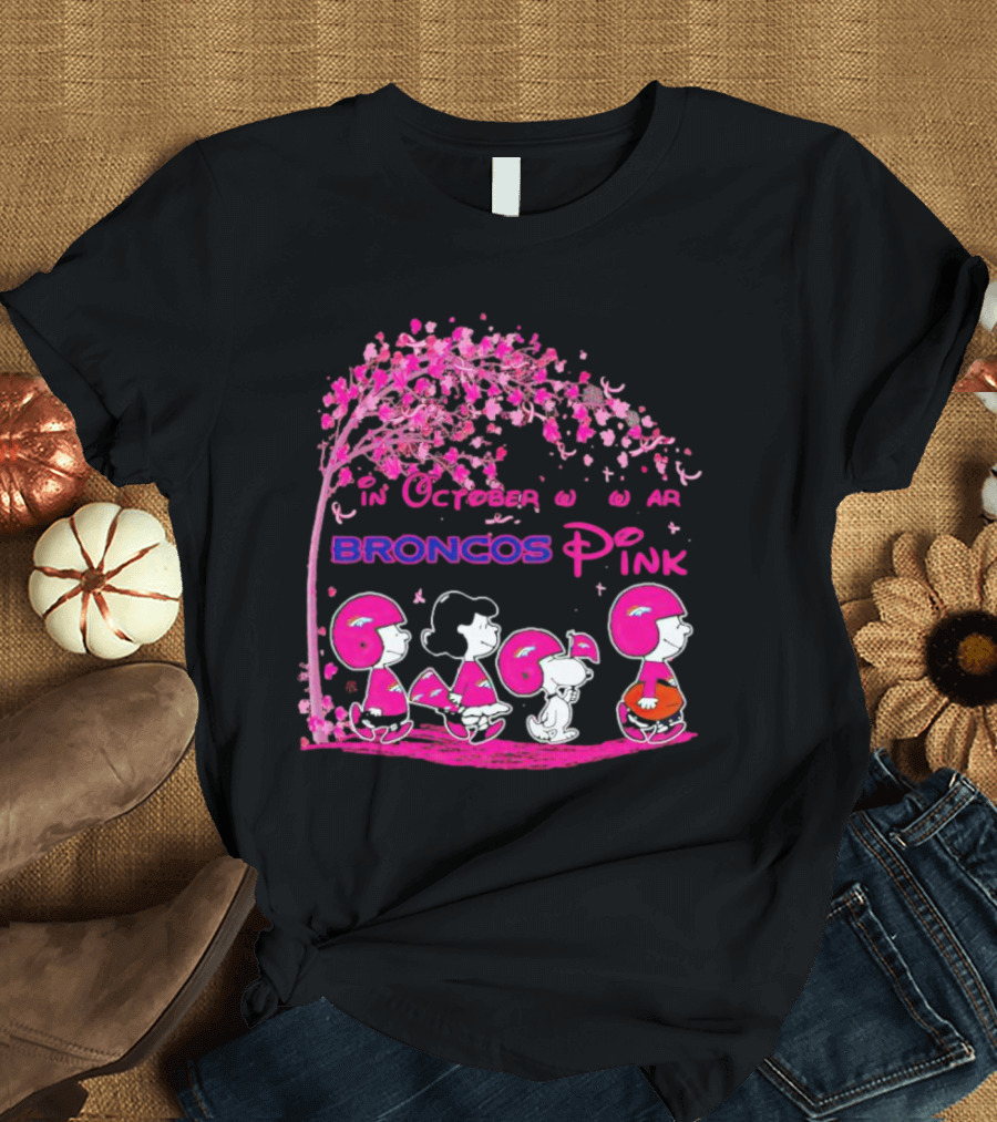 Peanuts Characters In October We Wear Broncos Pink Breast Cancer Awareness T-Shirt