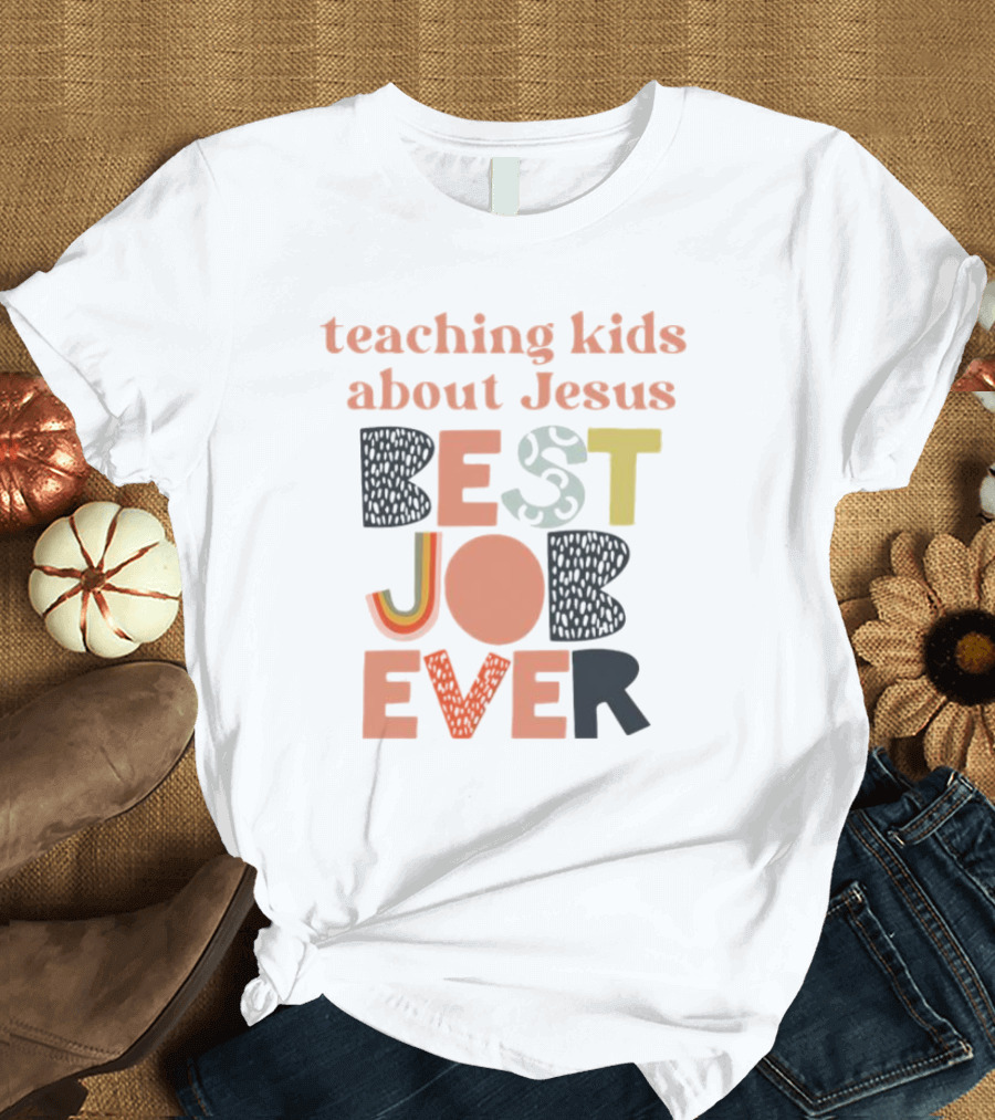 Teaching Kids About Jesus Best Job Ever Playful Inspirational Message Shirt made from 100% pre-shrunk ring-spun cotton, unisex regular fit based on U.S. standard sizing. The shirt is designed, cut, sewn, and printed in the United States. Available in sizes S-5XL.