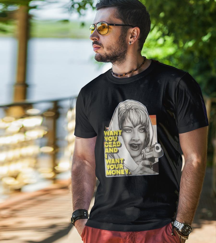 Want You Dead And I Want Your Money Retro Comic Style Woman With Gun Shirt made from 100% pre-shrunk ring-spun cotton, unisex regular fit based on U.S. standard sizing. The shirt is designed, cut, sewn, and printed in the United States. Available in sizes S-5XL.