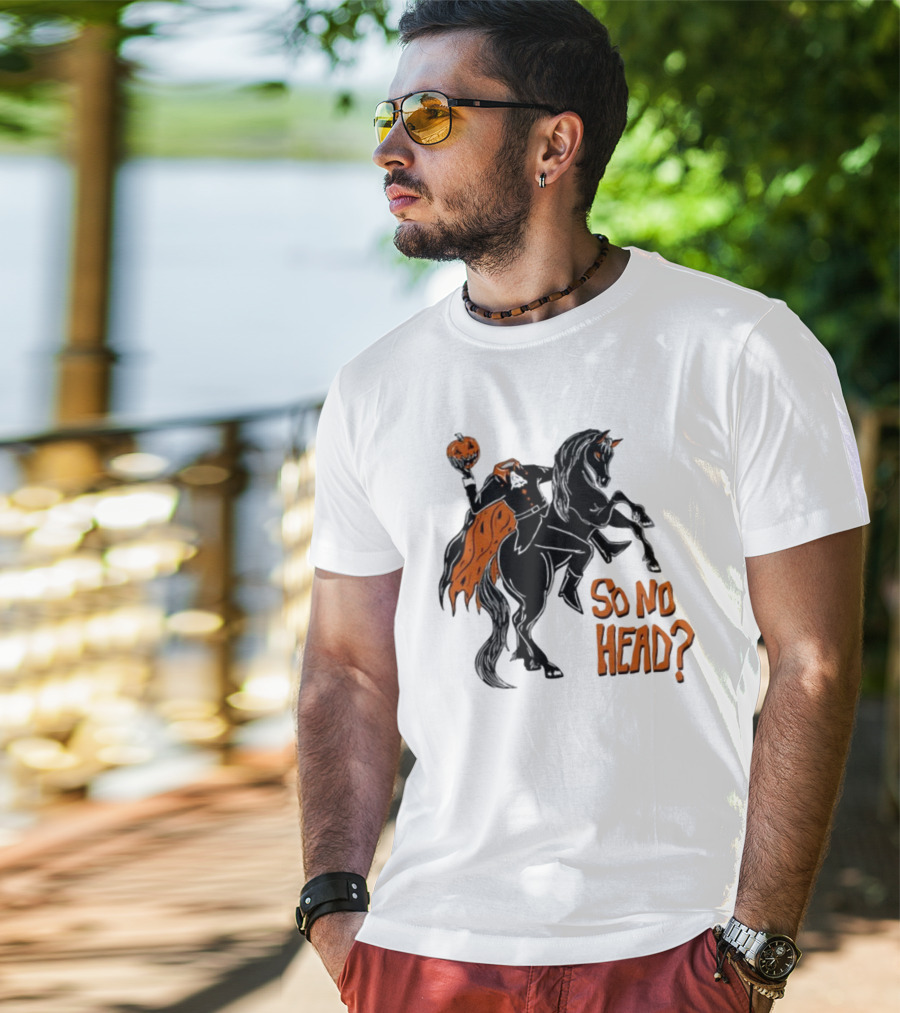 Oatmilklady Headless Horseman Pumpkin So No Head Shirt made from 100% pre-shrunk ring-spun cotton, unisex regular fit based on U.S. standard sizing. The shirt is designed, cut, sewn, and printed in the United States. Available in sizes S-5XL.