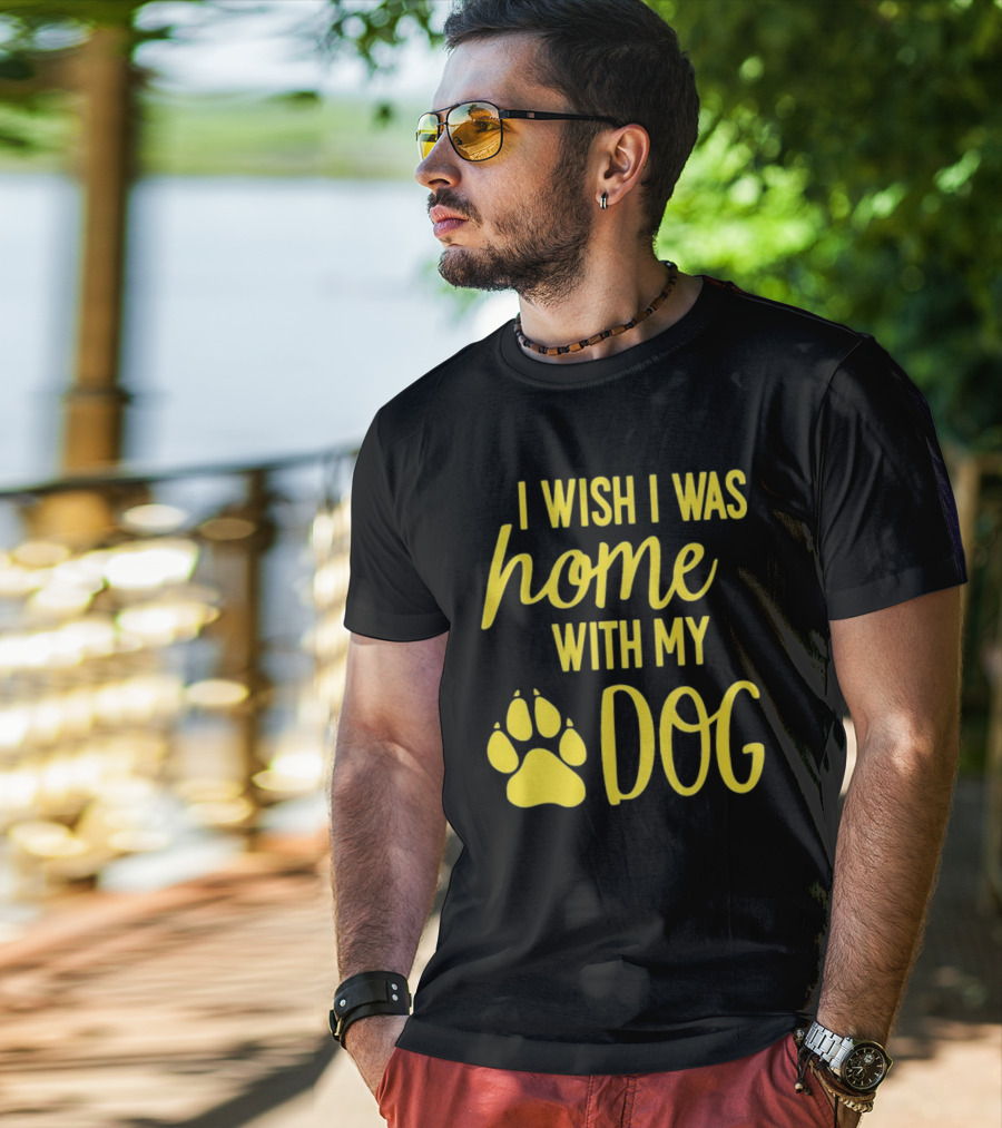 I Wish I Was Home With My Dog Paw Prints Shirt made from 100% pre-shrunk ring-spun cotton, unisex regular fit based on U.S. standard sizing. The shirt is designed, cut, sewn, and printed in the United States. Available in sizes S-5XL.