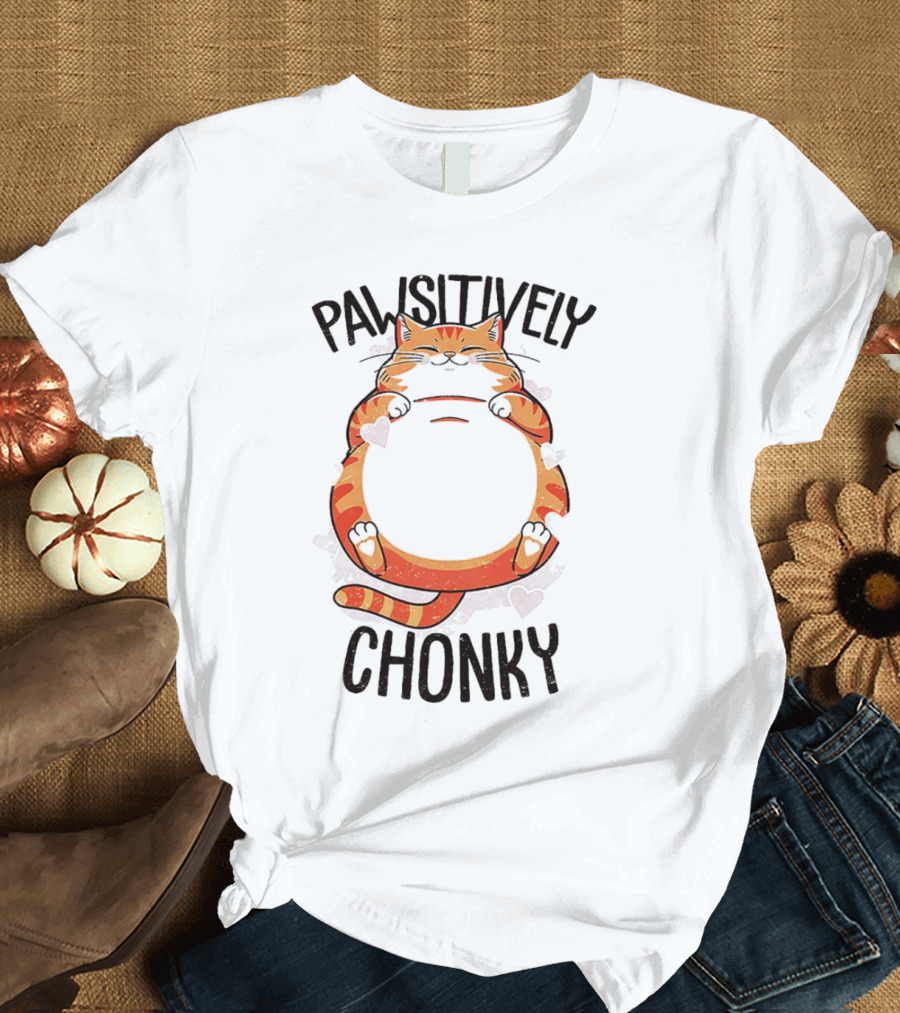 Pawsitively Chonky Cat with Hearts and Smiling Orange Tabby Shirt made from 100% pre-shrunk ring-spun cotton, unisex regular fit based on U.S. standard sizing. The shirt is designed, cut, sewn, and printed in the United States. Available in sizes S-5XL.
