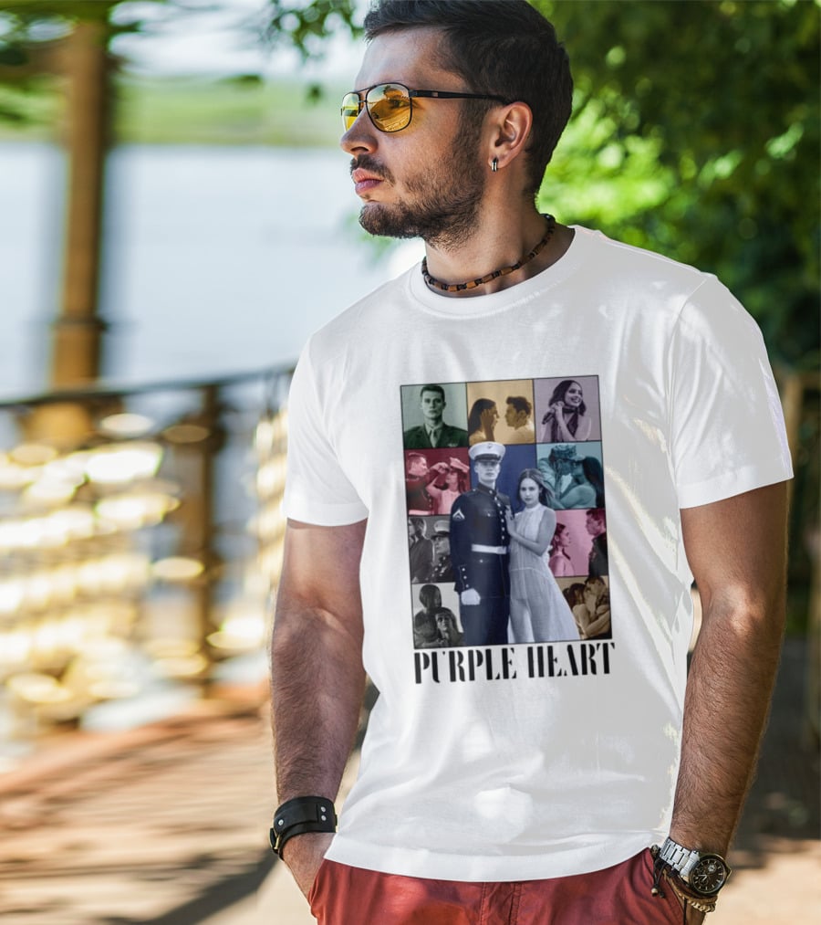 Purple Hearts Romantic Military Love Story Collage Shirt made from 100% pre-shrunk ring-spun cotton, unisex regular fit based on U.S. standard sizing. The shirt is designed, cut, sewn, and printed in the United States. Available in sizes S-5XL.