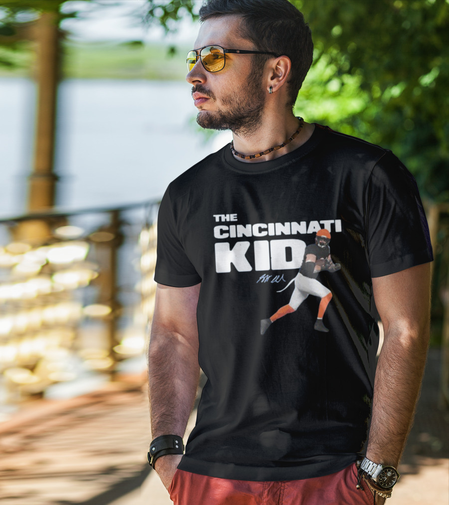 The Cincinnati Kid Football Player Graphic with Signature in Orange and Black Shirt made from 100% pre-shrunk ring-spun cotton, unisex regular fit based on U.S. standard sizing. The shirt is designed, cut, sewn, and printed in the United States. Available in sizes S-5XL.