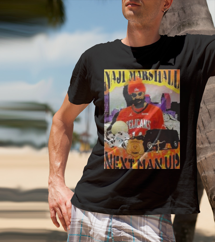 Naji Marshall Pelicans Next Man Up Badge Police Car City Background Shirt made from 100% pre-shrunk ring-spun cotton, unisex regular fit based on U.S. standard sizing. The shirt is designed, cut, sewn, and printed in the United States. Available in sizes S-5XL.